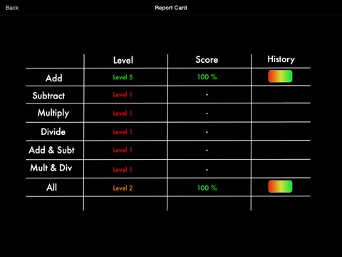 The app “Progressive Math,” also includes a report so that both parents and the learner can see their progress. The app includes 5 levels for each function; 1. addition, 2. subtraction, 3. addition and subtraction, 4. multiplication, 5. division, 6. multiplication and division and 7. addition, subtraction, multiplication and division.