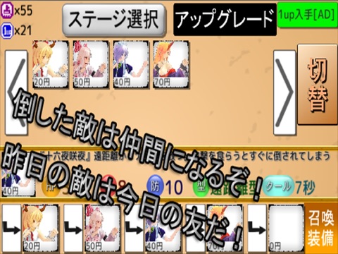 時間経過で溜まるコストを消費してキャラを召喚し、迫りくる敵を打ち倒す東方Projectの二次創作ディフェンスゲームです。