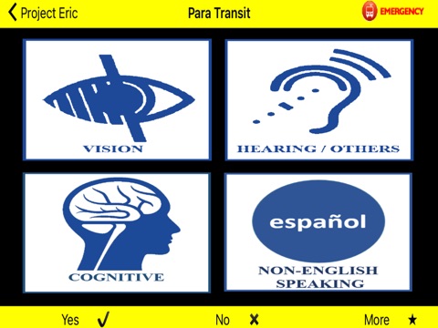 This Project Eric is a healthcare enhancement tool, which aims to utilize assistive technology to remove communication barriers in the public transportation system for passengers with disabilities. It can make passengers with disability ride public transportation easy and fun. Using assistive technologies, the mobile app can help passengers talk to the driver, get to know where to go, request for assistance, or express appreciation simply by touching and swiping. It can greatly increase their life quality as well as the participation in social activities.