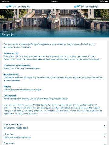 App met alle informatie en nieuws over het project: aanleg 3e kolk Beatrixsluis en verbreding Lekkanaal ter hoogte van Nieuwegein. De app bevat actuele informatie over de werkzaamheden, planning, eventuele hinder voor de omgeving en de maatregelen die we daarvoor nemen. Ook bevat de app veel beeldmateriaal over het project. De app biedt tevens de mogelijkheden om vragen te stellen en klachten in te dienen.
