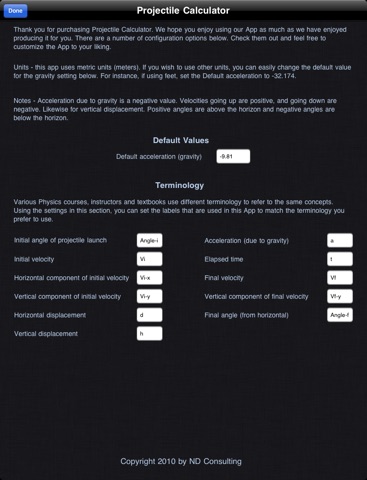 This app is an excellent tool for checking your projectile motion homework or playing what-if scenarios by easily changing values of an already-computed calculation. Given its ability to compute answers instantly, students can use it in class to catch mistakes made by the teacher as he/she demonstrates example problems (calculating things slowly using only a calculator). Teachers, use this app to check student answers or use the iPad version as a teaching aid to quickly display diagrams for problem sets.
