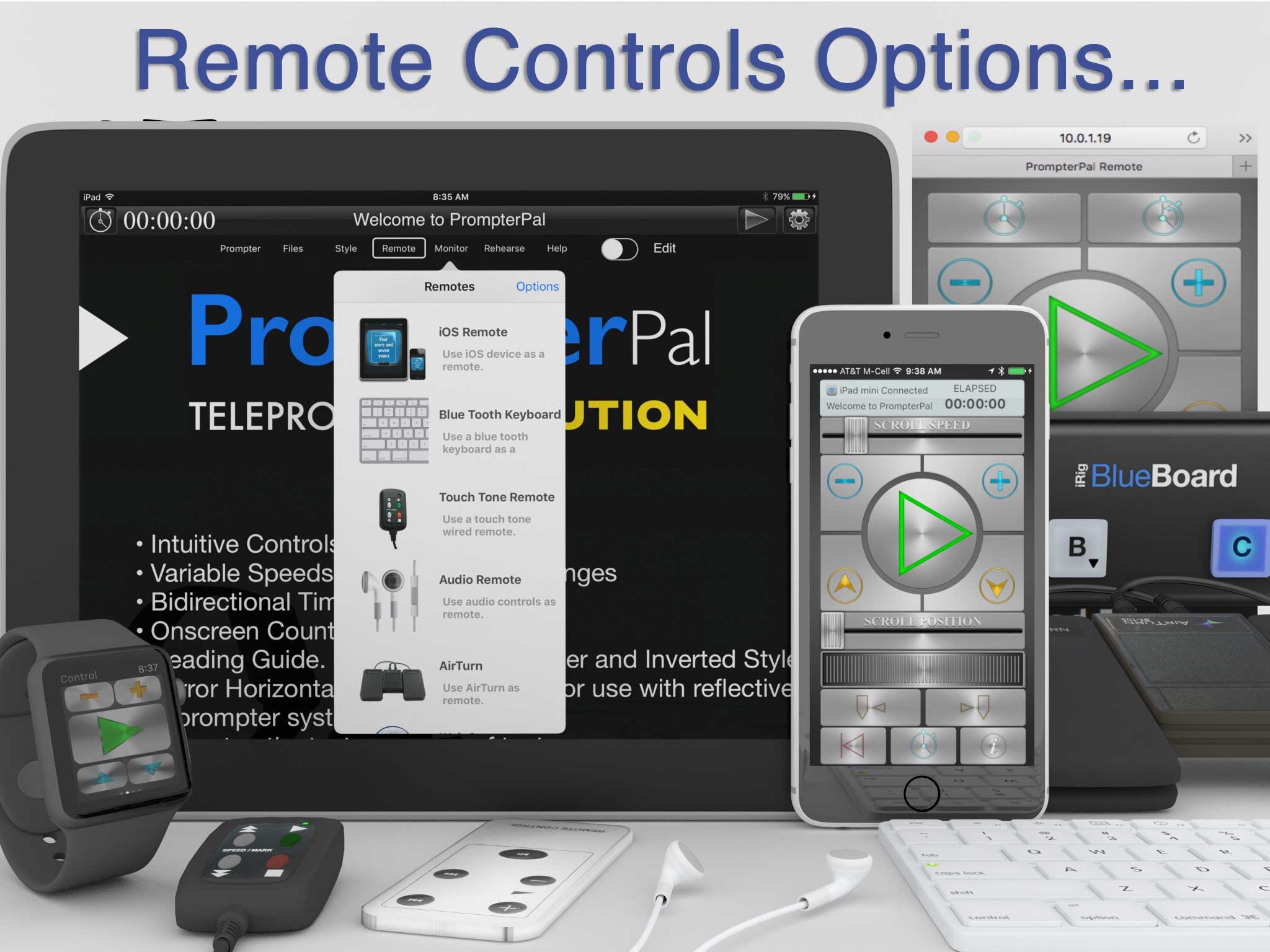 - AirTurn Remote: Use wireless remotes from www.airturn.com to control prompter features.