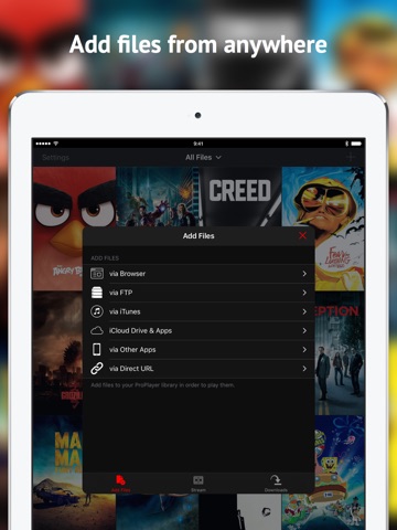 Stop converting videos for your device! Simply transfer any movie or audio file of any file format via WiFi, USB from your computer or download directly from the web to your iOS device and start watching. There is no conversion necessary.