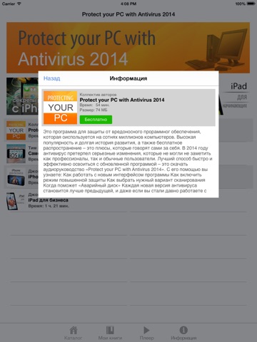 Ну и произношение - читает робот. Никакими 3 баксами здесь и не пахнет. Особенно смешно, например, слушать произношение адреса, с которого скачать антивирус Каспрского)) Разработчики, - удосуждесь хотя бы правильное чтение текста встроить в аудиокурсы, и лучше если вы это сами прочтете. Все-таки живой голос никак не сравнится с голосом машины. Многие моменты произношения очень смешные. ИМХО все аудиокурсы должны быть бесплатными так как здесь просто чтение роботом текста который валяется на просторе интернета. Программе один балл из десяти!