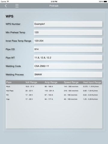 Protraak: Welding Procedure Specification (WPS) reference and heat input / welding parameter testing app. Universal app for iPads and iPhones.