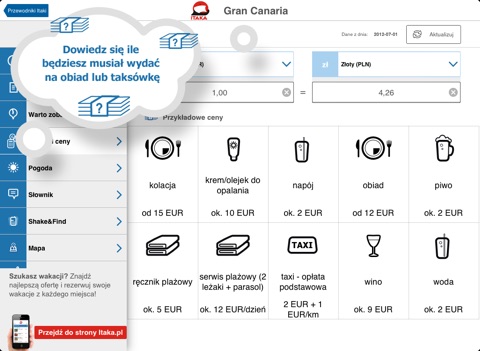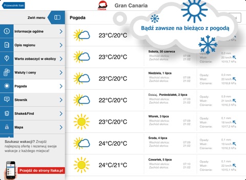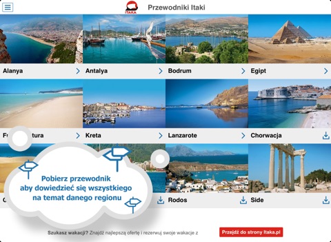 Chcesz wiedzieć więcej o miejscu, do którego się wybierasz? Sprawdzić, co warto zobaczyć w tej okolicy? Mieć pod ręką aktualną prognozę pogody i praktyczne zwroty w języku danego kraju? Aplikacja "Przewodniki" umożliwi Ci dostęp do tych i wielu innych informacji, niezależnie od tego, gdzie właśnie będziesz. Aplikacja działa także w trybie offline, dzięki czemu Twoje "Przewodniki" i wszystko, co w nich zawarte, będzie dla Ciebie dostępne w każdej chwili. Możesz również zalogować się do Strefy Klienta i zobaczyć szczegóły dotyczące Twojej rezerwacji.