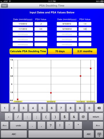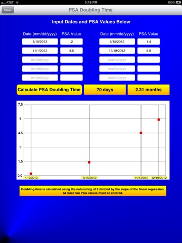 PSA doubling time is calculated using the natural log of 2 divided by the slope of the linear regression. Just input some dates with corresponding PSA values and the PSA doubling time will appear. You can put 2 to 10 entries.
