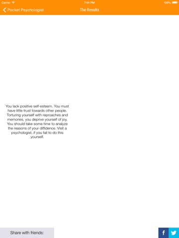 "Pocket Psychologist" is your guide on your way to self-actualization. In this app, you will find entertaining and useful psychological tests selected by a qualified psychologist. You can easily share your test results with your friends via social networks.
