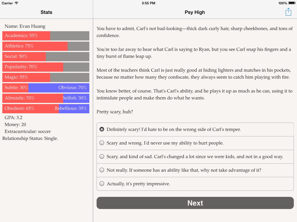 I really love this game, its definitely worth the money. At first I was a bit skeptical on how a text-based mystery game would play out, but Ive been at it for a good while now and I honestly love it. The idea of being a detective and going around with a couple of friends to investigate is really nice. I feel like I can connect to the characters in this a lot more than some other "Choice of Games" games that Ive played- (not that the others are necessarily bad). Whenever I figure something out I get really excited and freak out because its so invigorating to solve the mysteries before the characters do. Psy High definitely takes the place for my new favorite "Choice" game, and I really think its amazingly done.