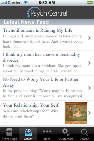 The Psych Central app allows you to keep tabs on the latest psychology and mental health news, research, and blog postings by the dozens of contributors to PsychCentral.com. It automatically loads the latest news so youre always up-to-date.