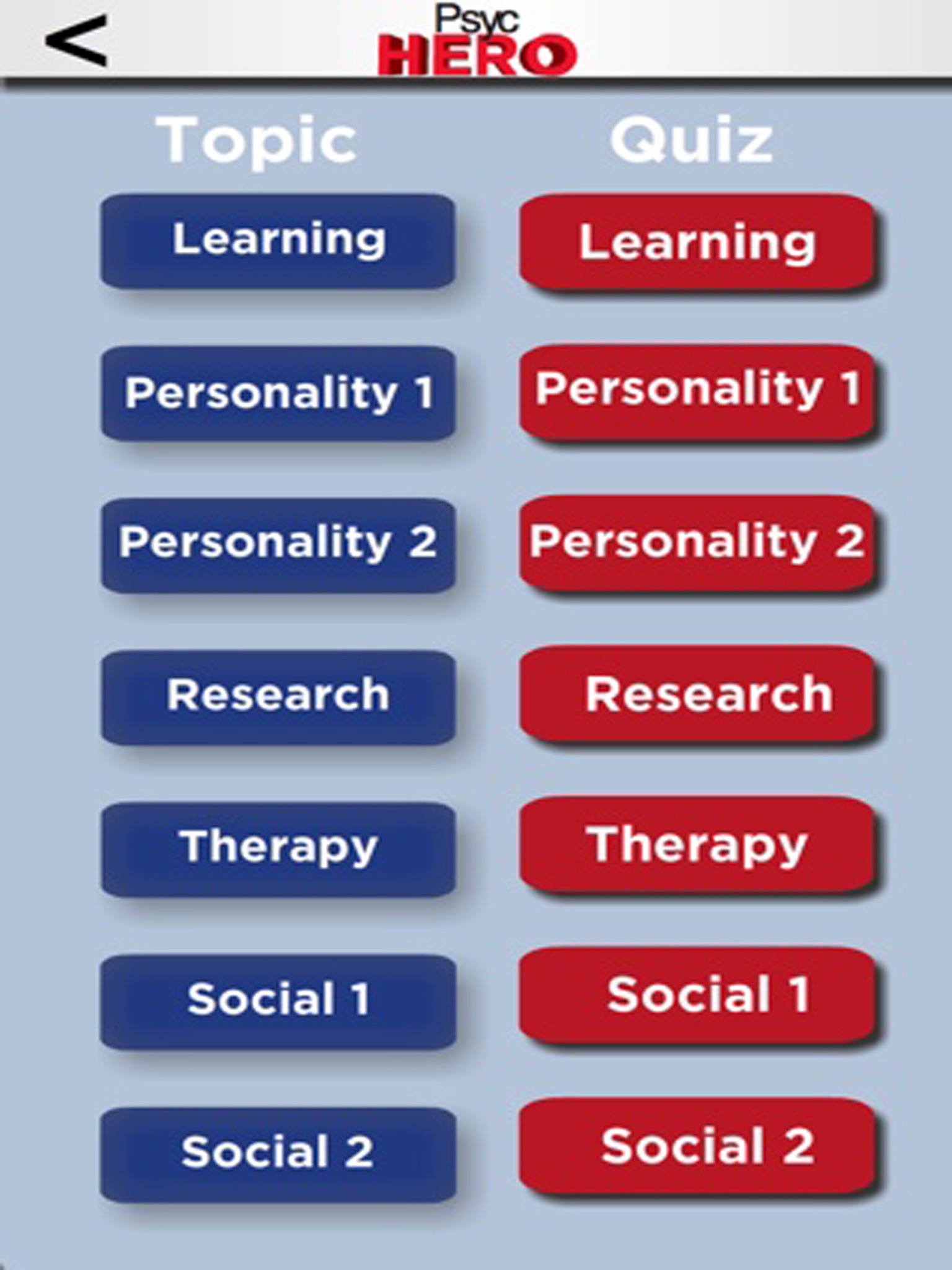 There is no other test prep app like Psyc Hero. Psyc Hero uses concept maps, brief audio definitions and quizzes to help you study for many kinds of psychology tests - class exams, GRE, EPPP, - even the NCLEX.