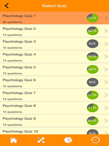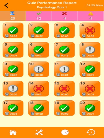 - You can review a quiz session performance details by selected a session. This screen shows quiz history performance reports.