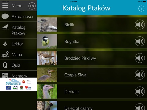 1) Katalog ptaków, które można spotkać i usłyszeć na każdym nadwiślańskim spacerze po Stolicy. Katalog zawiera opisy cech charakterystycznych 30 gatunków ptaków, ich zdjęcia oraz nagrania śpiewu umożliwiające ich łatwiejszą identyfikację w terenie.