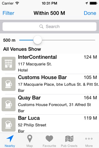 This view will show you all the pubs bars and clubs around you. The venues are ordered by distance (all distances are estimates as your location is never 100 percent). The Venues are listed with their names, address, distance and categories for the venue. You can Zoom In / Out using the buttons along the top of the navigation bars. You are also able to filter down the list by using the search bar at the top of this view. By selecting a row from this view you will be sent to the Venues Detail page.