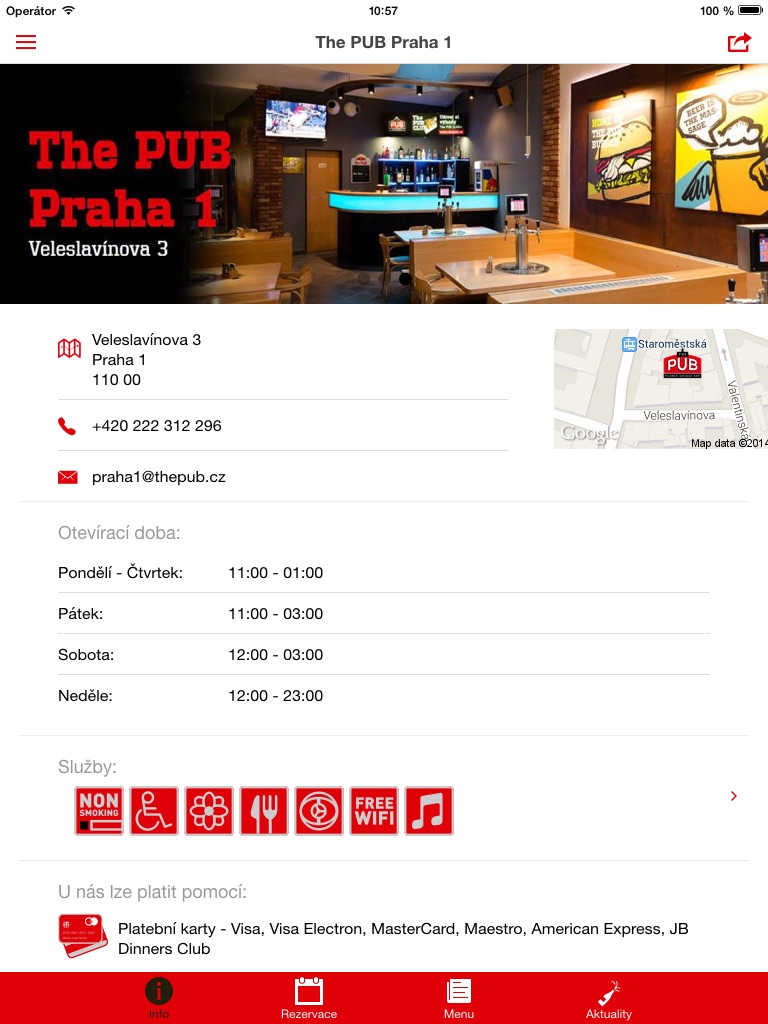 The application The PUB World allows you to easily locate the nearest restaurant The PUB. It clearly displays information about opening hours, contacts and services in each restaurant in The PUB chain. There is an access to the food and beverage menu including the daily lunch menu. At any time you can use the application for online booking with selection of a specific table in a restaurant. Members of The PUB Club loyalty program may access their account thru the application. Thanks to the application you can be always informed about the latest news and special offers at various The PUB restaurants.