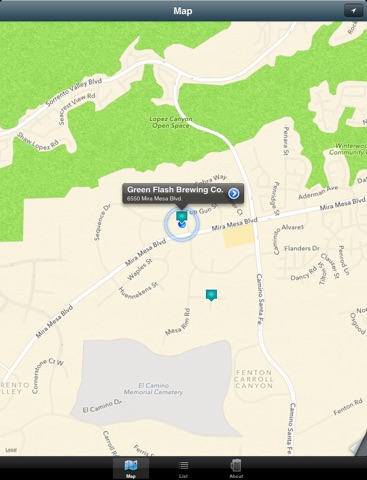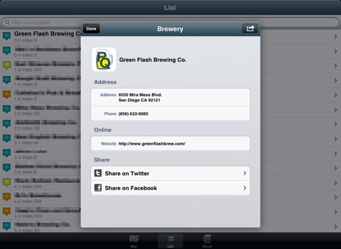 The app locates you on the map and allows you to zoom in to that location or pan around the map. Brewery locations from the extensive database appear on the map as you zoom and pan. You can identify each brewery and get further information such as address, phone number, and website as well as bring it up on a map to get directions. You can quickly and easily post your presence at that location on Facebook or Twitter.