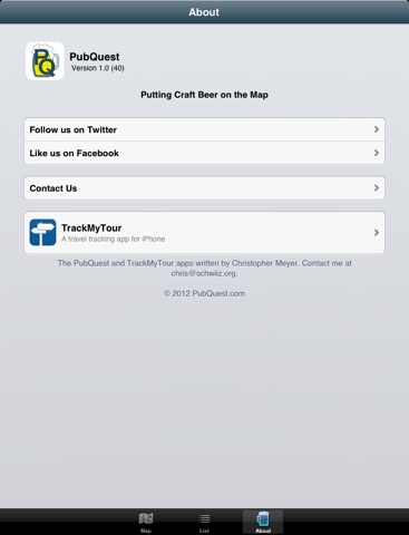 PubQuest is a craft beer mapping company. The website (www.pubquest.com) includes an interactive map to search by location or name of a brewery. We also provide custom maps to brewers guilds, beer festivals and events, and individuals going on a beer adventure. Use your iOS app while on the road and check out the website when you are back at your computer!