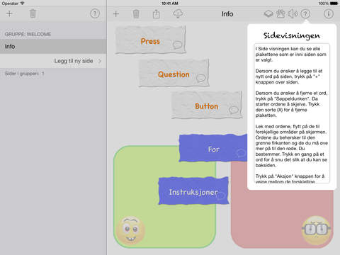 Glosene fremkommer som "brikker" som du kan flytte rundt på skjermen. Om du trykker og holder på et ord, sier appen ordet på det språket du har valgt.
