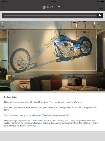 A mobile tour-guide app for Pullman Jakarta Central Park. Hotel gallery It guides you through sculptures, paintings, and other masterpieces spread among the hotel. It also gives you a quick look to room facilities and events.