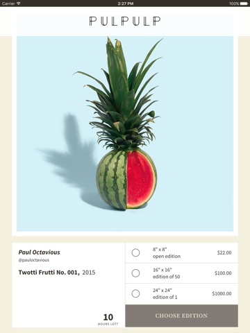 PULPULP works with a hand picked group of talented artists to create beautiful limited edition archival quality prints. With the PULPULP iOS app, you can purchase these amazing prints as soon as theyre available. Prints sell out fast - be sure to subscribe to push notifications so you wont miss out.