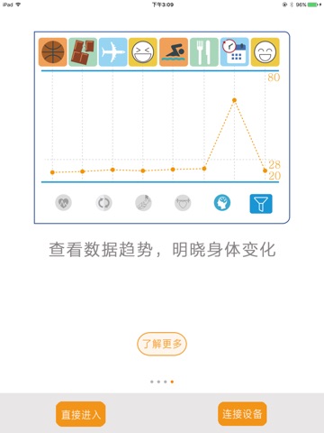 本应用适用于Pulsebit Mate 健康追踪器。应用获取设备数据,显示数据列表与数据趋势,并能将数据与好友分享。