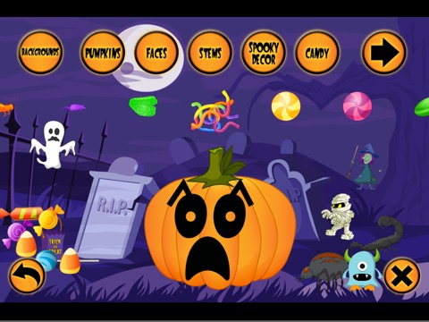 Create endless Halloween scenes with 4 backgrounds, variety of pumpkin shapes, over 25 faces, stems, wigs, candy and spooky décor. All Treats no Tricks!