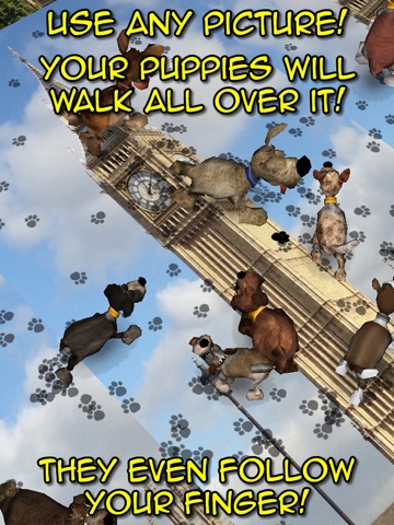Or, you can select any picture for your puppies to run and play on, leaving footprints as they go! Theyll follow your finger! Use any image you like, freak out your friends by fooling them into thinking your phone screen has been taken over by puppies!