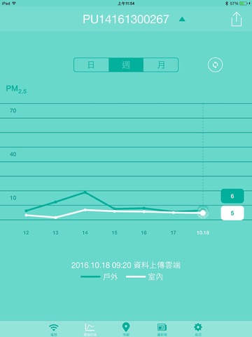 環境紀錄:顯示當下室內/室外空氣品質,並記錄長時間空氣狀況