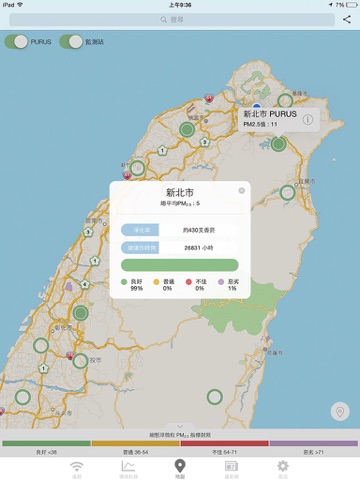 地圖:顯示各地監測站及PURUS PM2.5指數