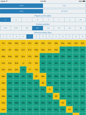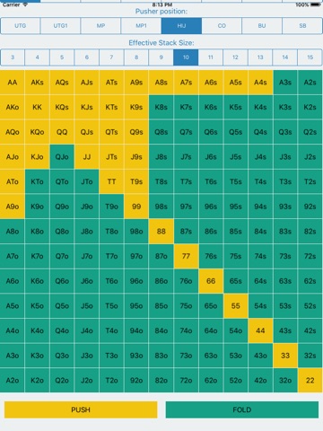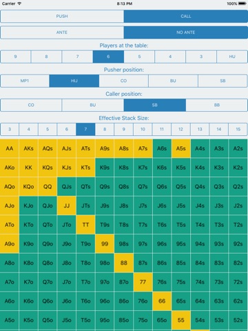 The Push Helper app is based on the Nash equilibrium and shows all of the profitable push or call ranges.