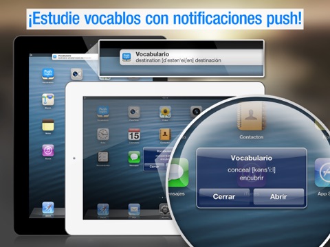 PUSH Inglés le permite aprender vocablos en inglés sin abrir la aplicación porque le envíael vocablo, su significado y la pronunciación en reiteradas notificaciones push.