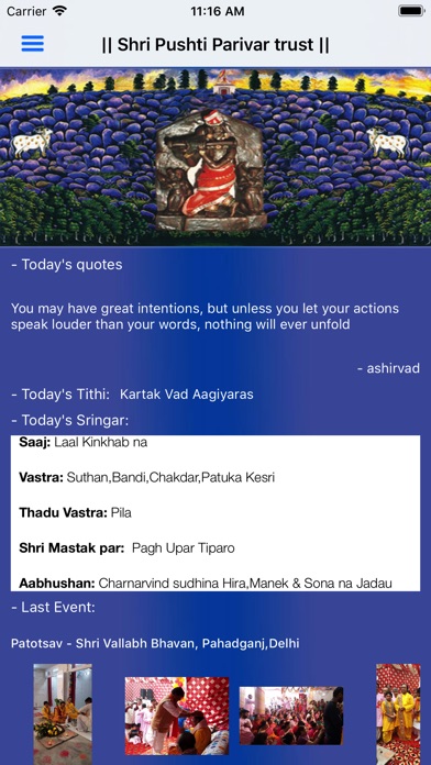 App Contains information about Pushti Parivar Trust, AacharyaShri, Bhajans in mp3 Format, videos of various Pushtimargiya Granth, Photos of Latest Events occur under Trust and Brijdham Satellite, Details of Activities governed by Pushti Parivar, Aacharya shri YadunathJi Mahodayshri.