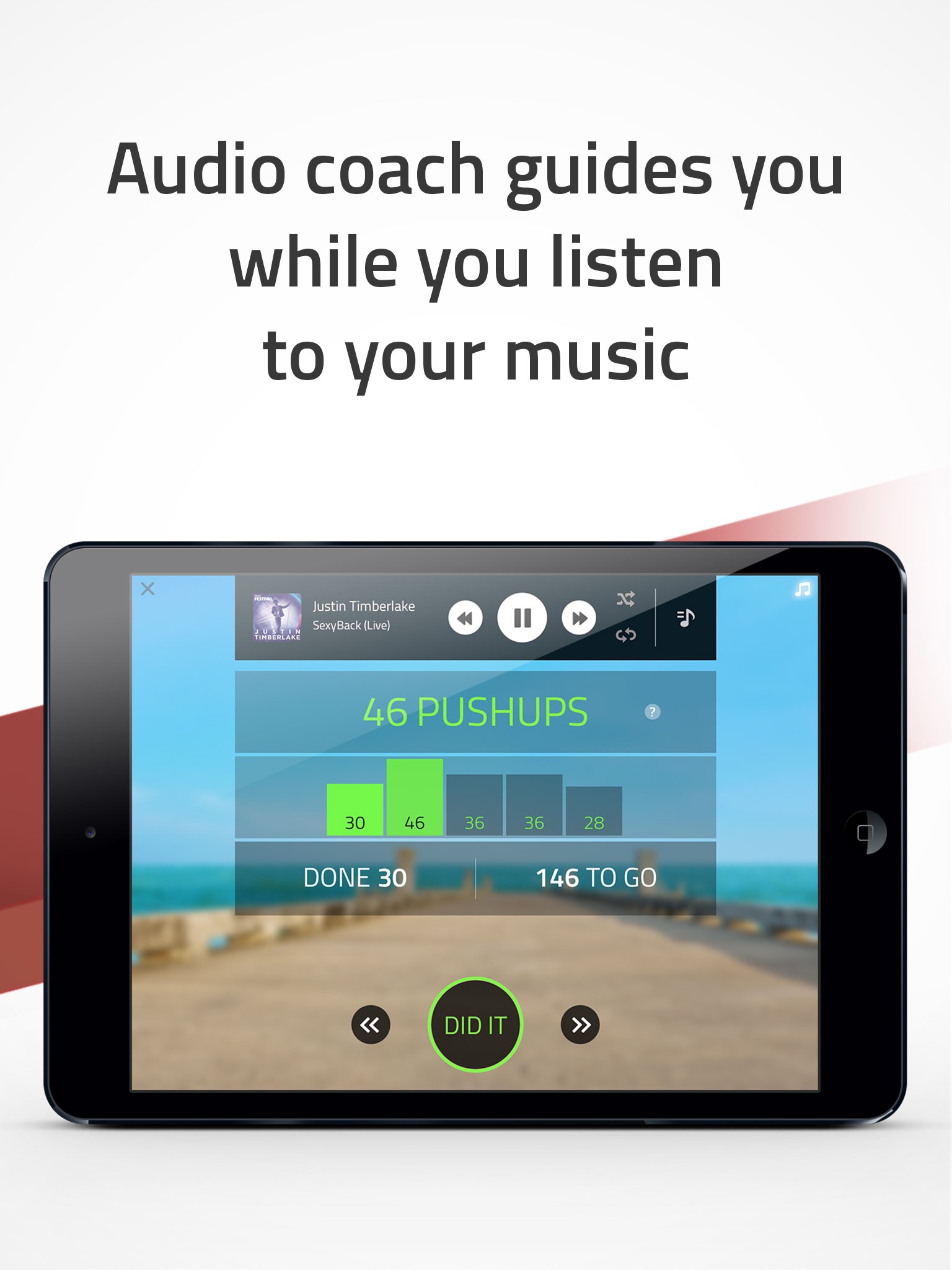 When you start a workout, you turn on your favorite music, and the apps audio coach tells you exactly how many pushups to do, when to rest, and when to resume. The app also keeps you motivated, which is the key to success and the true magic of the app. The plan is achievable and enjoyable even by people that never liked to exercise, and you will earn wins and badges as you go along.