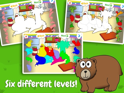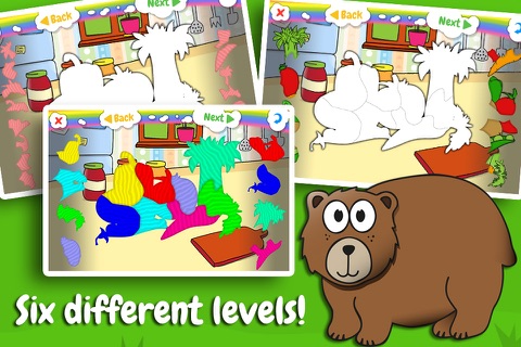 Just like with real world puzzles, the goal is to create an image out of the pieces given on-screen. In order to make the game suitable for children of different ages (2 – 8 years old), there are 6 difficulty levels that affect the gameplay. The difficulty is based upon several factors – the number of pieces, the color of the pieces, the precision of placement and the existence of piece outlines. Lower difficulties have less pieces of same color, less need for precise placement and a visible puzzle outline. Higher difficulties demand a sharper eye, a bit of logic and more precision.