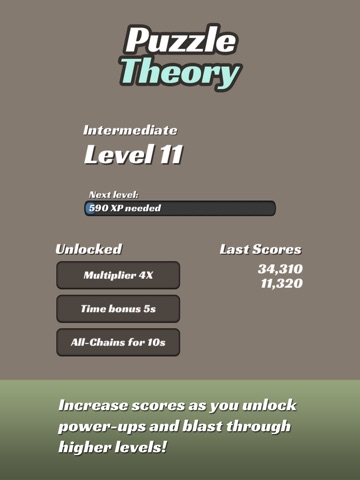 A new take on color matching, PuzzleTheory is a fast-paced game to test your puzzling ability! Chain and combo tiles to score as many points as possible before time runs out. Easy to learn but challenging for even for the most advanced puzzle game players. Play to level up and unlock better power-ups!