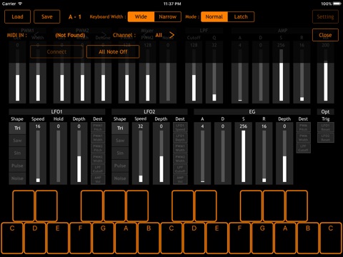 MIDI is supported only "Note On", "Note Off" and "All Note Off".