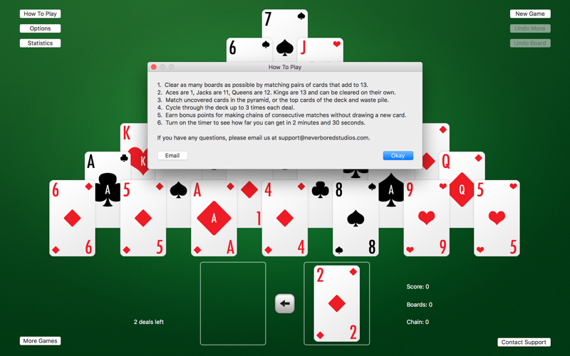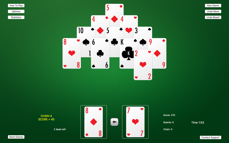 In this single-player card game, work your way from the bottom of the pyramid to the top, clearing away pairs of cards that add to 13.