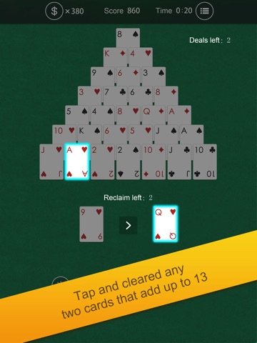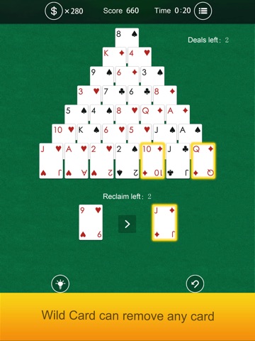 Pyramid Solitaire, a casual game that will bring you so much fun. Combine two cards and guarantee the sum of numbers on the two cards to be 13 to remove the two cards. More cards you remove, more points will you get!