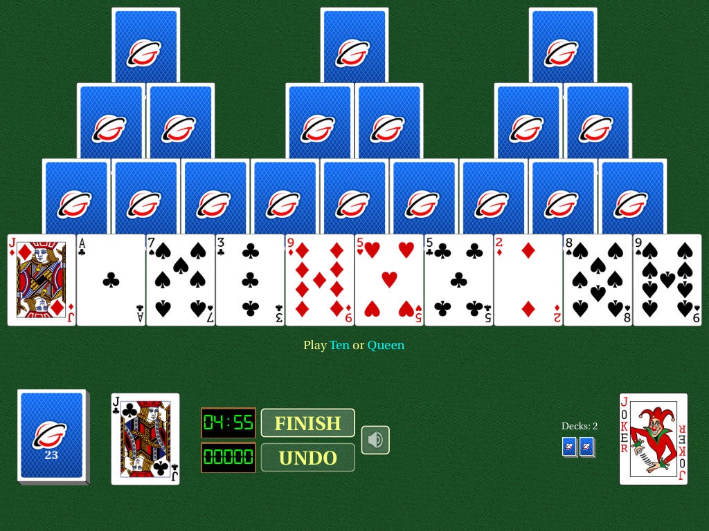 Pyramids Rush Solitaire Online uses two standard 52-card decks and one Joker card.