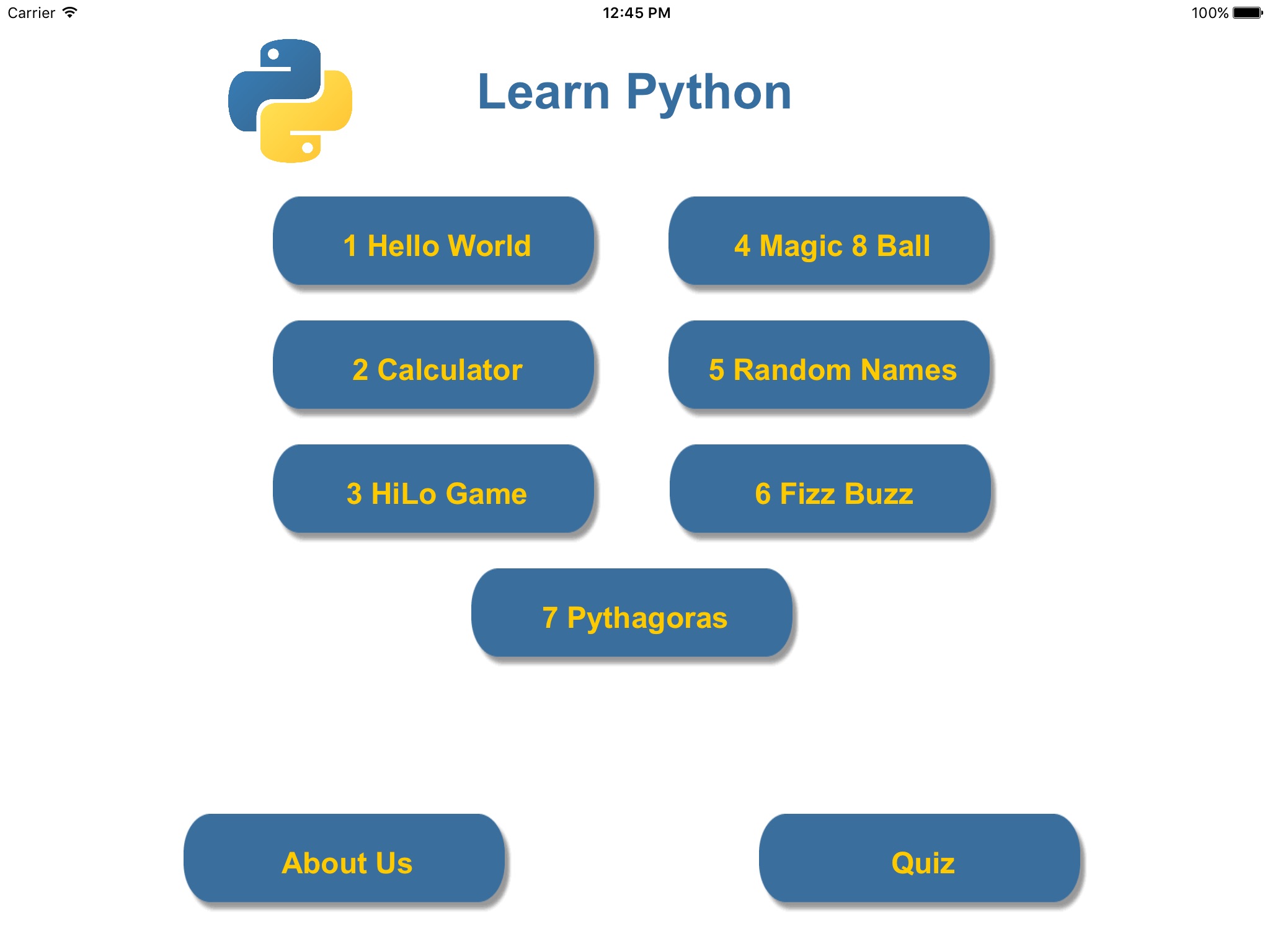 The app itself will expand over time, but so far there are 6 distinct python tasks to make. A simple calculator program, a hi lo game, a magic 8 ball, a random name picker, the fizz buzz game and a Pythagoras calculator. These would keep new programmers busy in class for a fair few hours and this app is an ideal tool to help cover the requirements of the new computing curriculum in the UK. Of course it will also benefit anyone on the planet who can follow a bit of spoken English and wants to learn to code in python too.