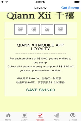 3) Coupon system. Collect 4 stamps to enjoy a mobile voucher