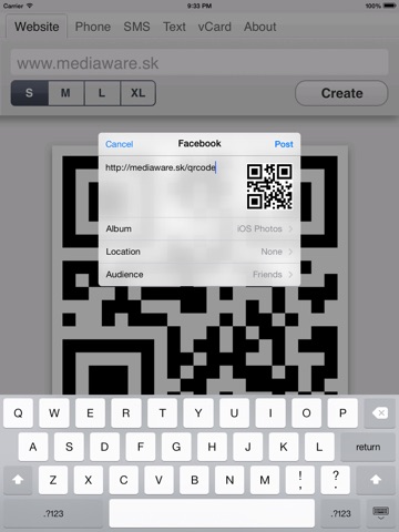 * Resulting QR Code can be saved in your Photo Album for later reuse and sharing, copy it to clipboard or print it