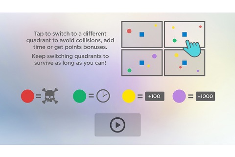 You will start with 60 seconds on the clock. Tap to switch to one of four quadrants with perfect timing to avoid obstacles, and collect time extensions and extra points. If a red obstacle collides with your blue body, its game over! If a green object makes contact with you, you gain extra time. Yellow or purple give you bonus points.
