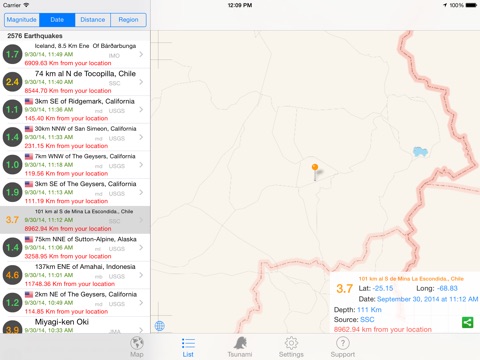 • Sort the list by Magnitude, Location, date or distance from your location.
