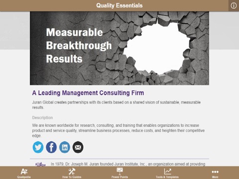 Jurans Quality Essentials app is a comprehensive mobile resource for professionals tasked with improving business performance and achieving operational excellence. The app provides a one-stop tool that includes: