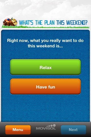 Are you tired of doing the same things every single weekend? Do you need advice that meets your needs? This app is for you. WHATS THE PLAN THIS WEEKEND? is a fun app that will give you ideas for the weekend based on your budget, your company needs and even your hunger! So if this weekend you want to relax, prefer to save some money and want to eat... we have the plan for you. Download our weekend planner and try it out!
