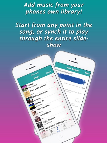 Make beautiful slideshows with music in a snap! Use one of your own songs or pick one of our own. When it comes to making slideshows from your phone, its best to KEEP IT SIMPLE! Create beautiful customized slideshows in just a snap!