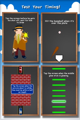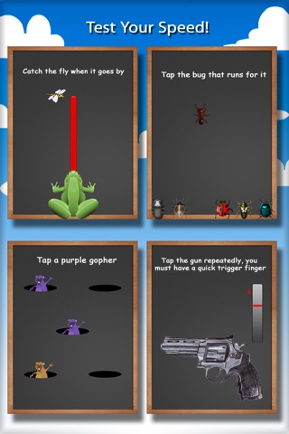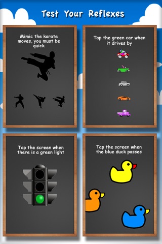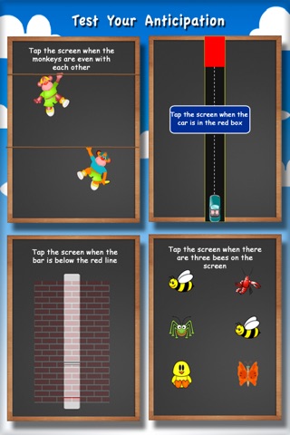 Challenges are set up as mini games. Some of the challenges focus on sports such as testing your baseball swing, karate prowess, or cheerleader synchronous. Some challenges focus on racing cars or running bugs, they will sometimes race each other or run from you. In other challenges you can see how fast your trigger speed is with taps, or try to win a quick draw gun fight. There are also challenges where you will need to catch apples in a bucket or quickly tap the animal that makes a sound. There are so many brainteasers, runner and rush games combined into one app!