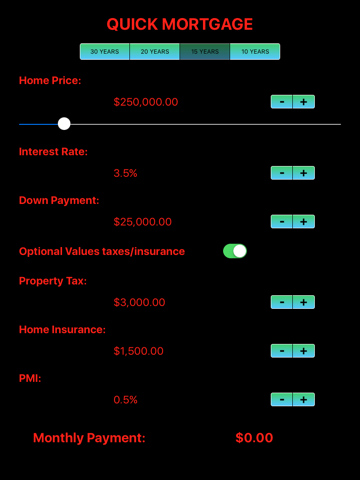 Quick Mortgage is a simple and efficient tool that will simplify your real estate research by calculating mortgage payment for your future house! Just enter House Price, Interest Rate, and Down Payment if any. Also, you have an option to enter Property Tax, Home and Mortgage Insurance.