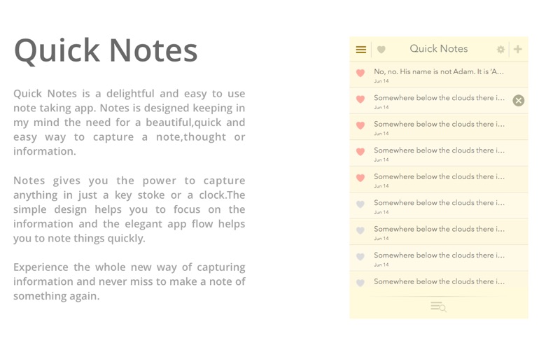 Quick Notes is a delightful and easy to use note taking app. Notes is designed keeping in mind the need for a beautiful, quick and easy way to capture a note, thought or information.